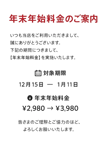 ⚠️年末料金のお知らせ⚠️